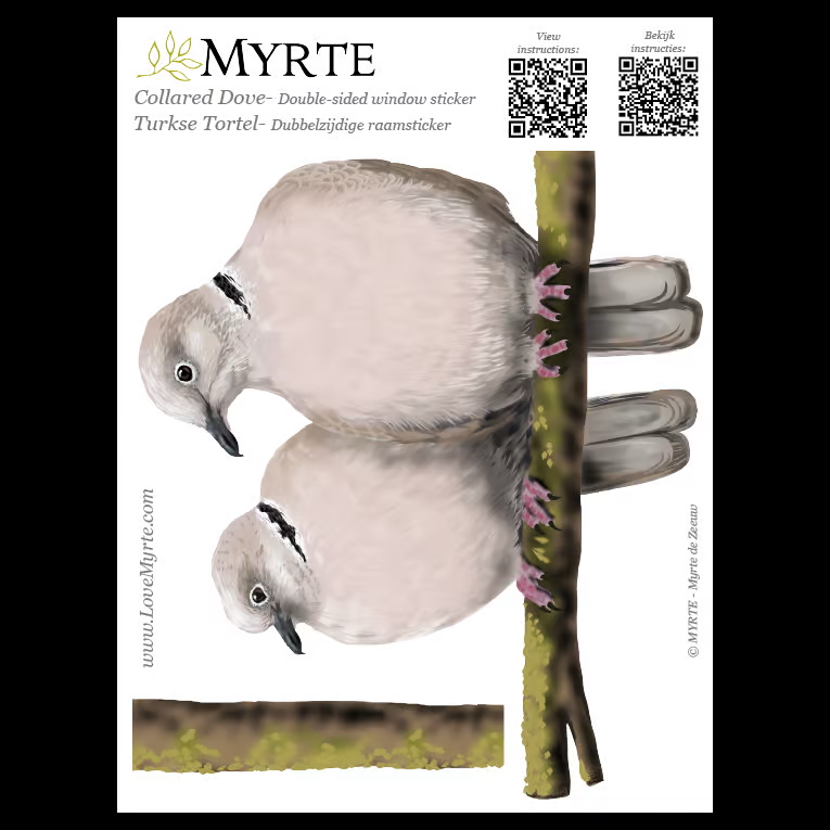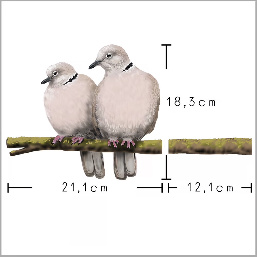 - 21×24,5cm (± A4) vel met 2 stickers die een paartje Turkse Torteltjes vormen op een tak van maximaal 32 cm lang. Zie foto´s voor de exacte maten per sticker.