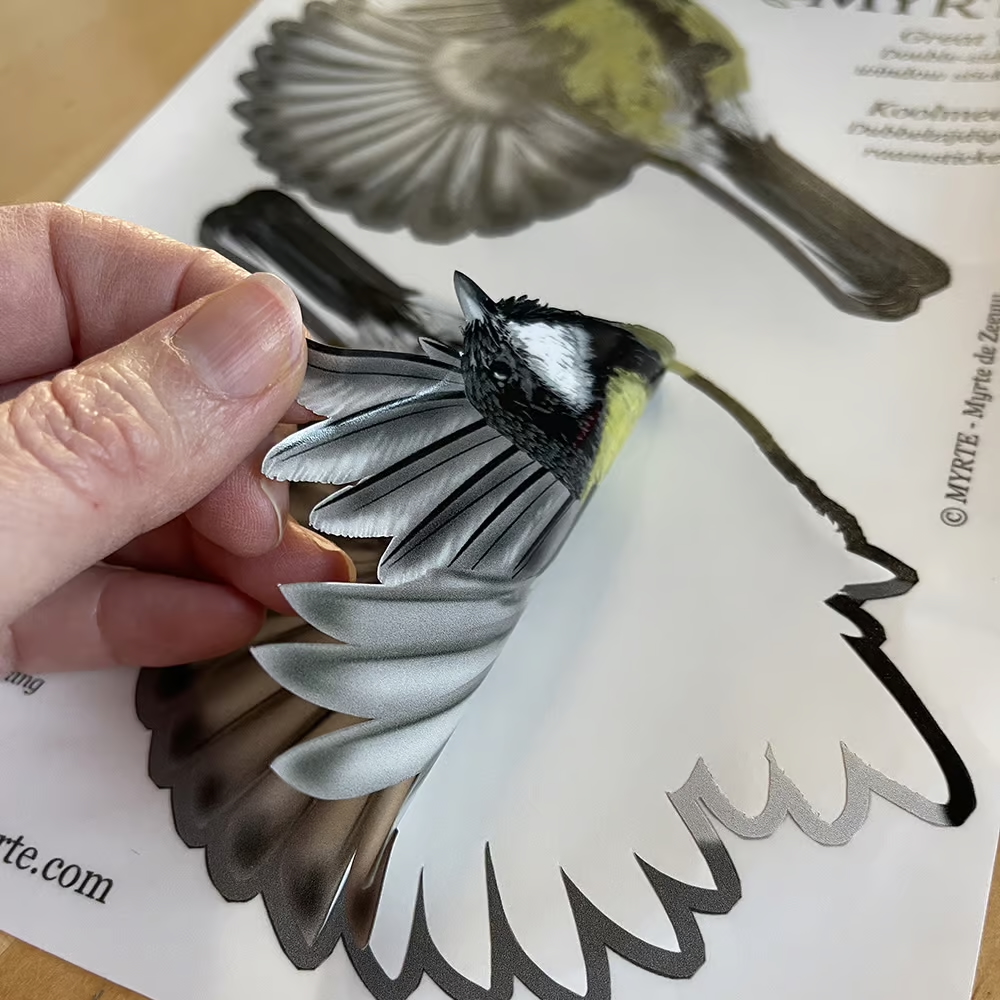 Deze dubbelzijdige raamstickers verbreken de weerspiegeling zodat vogels zien dat ze daar niet heen kunnen vliegen. Deze stickers zijn helemaal nieuw en uniek in de wereld!