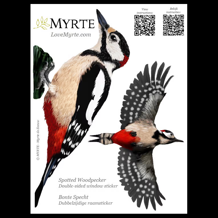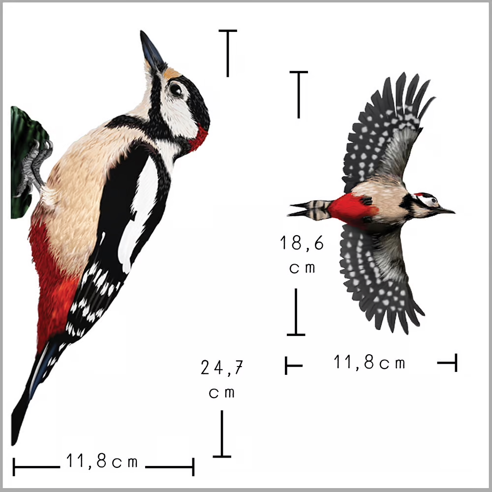 • 19,5 x 26 cm sheet met 2 stickers van bonte spechten 11,8 x 24,7 cm en 11,8 bij 18,6 cm