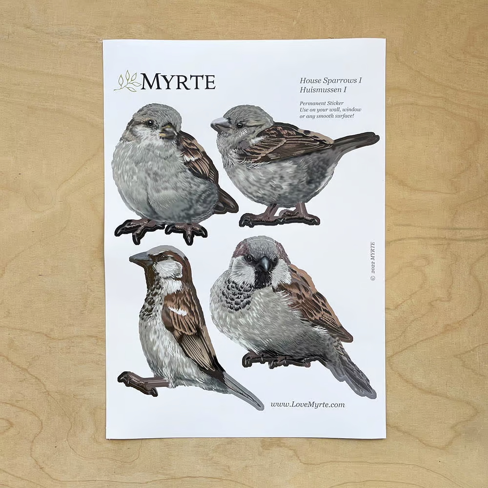 - 21x29cm (± A4) vel met 4 stickers met huismussen. Mus 1: 12 x 8,6 cm, Mus 2: 12,3 x 11,9 cm, Mus 3: 9 x 10,2 cm, Mus 4: 13,7 x 10,5 cm