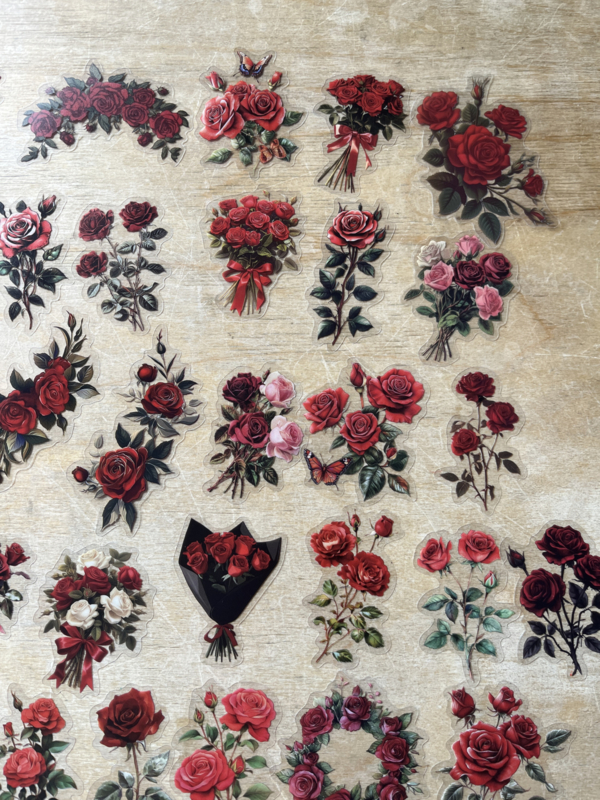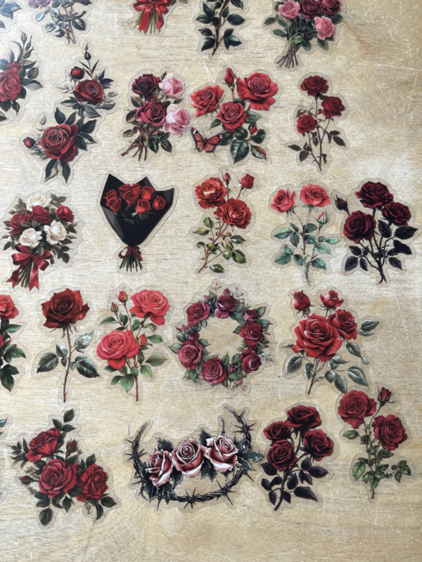 OverzichtSet van 50 transparante stickers met illustraties van rozen. Leuk voor op een cadeautje of als cadeautje, op een kaartje of een envelop of vrolijk een agenda, schrift, telefoon, laptop, doos of blik.